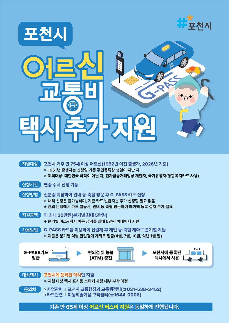 지원 대상은 포천시에 주소를 둔 만 75세 이상 어르신(1952년 이전 출생자)으로, 기존 우대형 교통카드(G-PASS) 발급자는 별도의 신청 없이 혜택을 이용할 수 있다.
