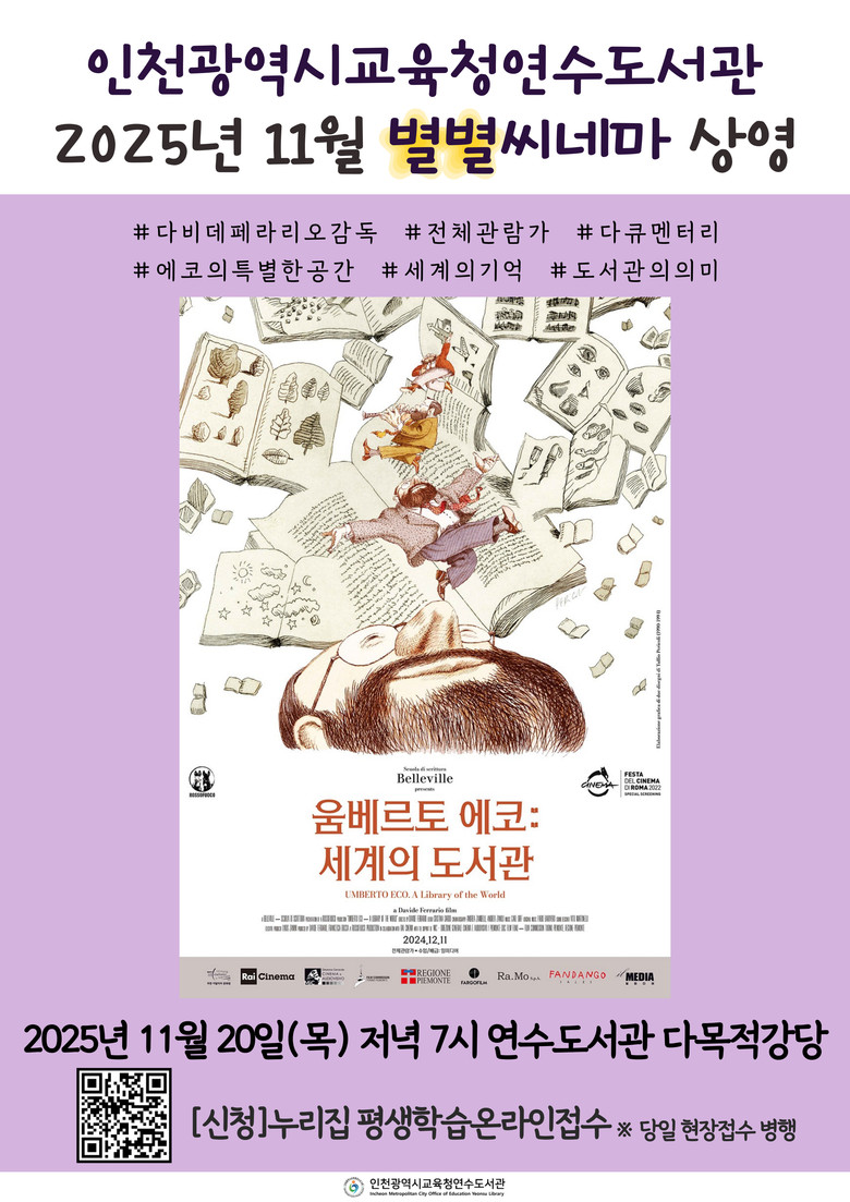 관람 희망자는 10월 28일 오전 8시부터 연수도서관 누리집(https://lib.ice.go.kr/yeonsu/index.do) 또는 현장 접수로 신청할 수 있으며, 자세한 문의는 디지털자료실(☎032-899-7570, 7571)로 하면 된다.