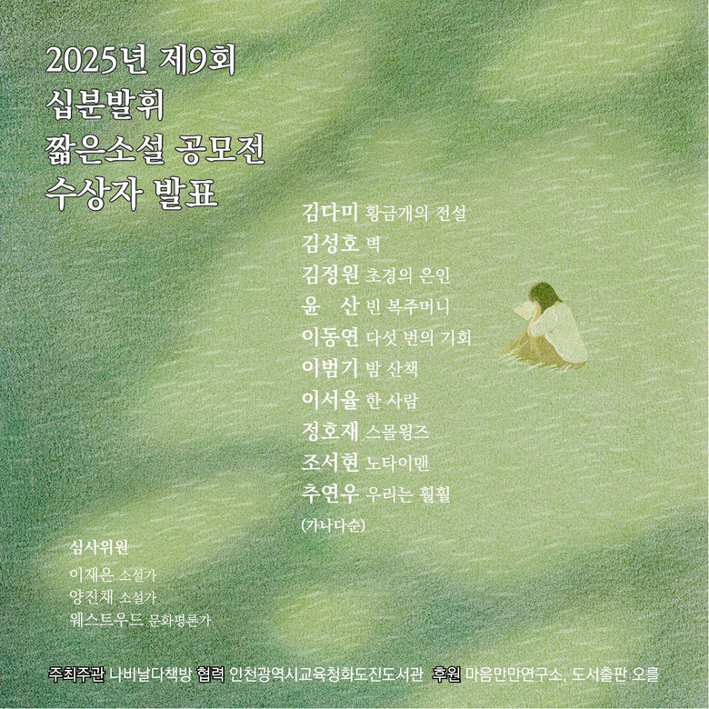 시상식은 10월 25일(토) 오후 5시 나비날다책방에서 열릴 예정이며, 선정된 작품들은 작품집과 도서출판 오를의 후원으로 전자책으로도 발간된다.