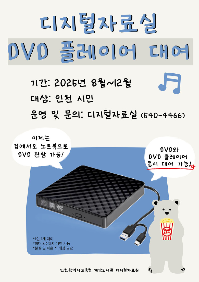 최근 노트북과 PC에서 광디스크 드라이브가 사라지며 DVD 이용에 불편을 겪는 사례가 늘어남에 따라, 외장형 DVD 플레이어를 무료로 대여하는 서비스를 마련했다.