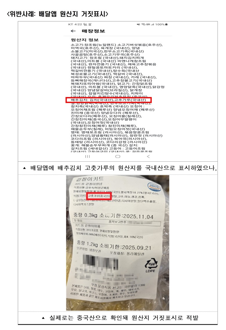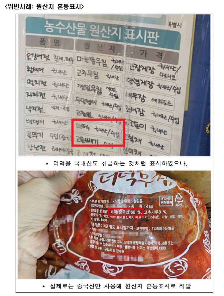 배달앱에 원재료인 고춧가루를 국산으로 표시했으나 실제로는 중국산인 업소와 국내산이 포함된 것으로 표시한 더덕이 실제로는 전량 중국산인 업소 등이 적발됐다.