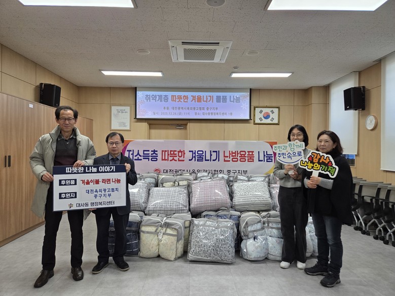 [중구 세계타임즈=이채봉 기자] 대전 중구 대사동(동장 유재경)은 대전옥외광고협회 중부지부 (지부장 고재춘)에서 겨울이불과 라면(300만 원 상당)을 기탁받았다고 28일 밝혔다.