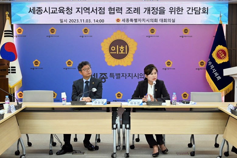 [세종 세계타임즈=이채봉 기자] 세종특별자치시의회 여미전 의원(더불어민주당, 비례대표)은 3일 의회청사 1층 대회의실에서 ‘교육청 지역 서점 협력에 관한 조례 개정을 위한 간담회’를 개최했다.