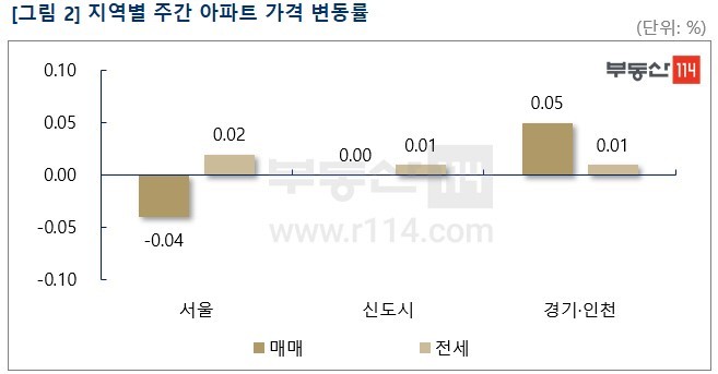 부동산114(www.r114.com)에 따르면 연휴로 인해 2주간의 시세 조사분이 반영됐음에도 불구하고 서울 아파트 매매가격 변동률은 2주전 보다 하락폭(-0.07%)이 줄어든 -0.04%를 기록했다. 재건축 아파트와 일반 아파트가 각각 0.13%, 0.02% 떨어졌다. 이밖에 경기ㆍ인천이 0.05% 올랐고 신도시는 보합세(0.00%)를 나타냈다.