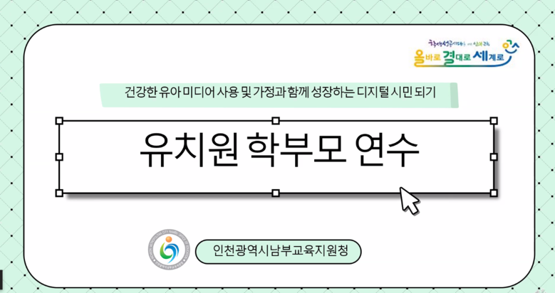 [인천 세계타임즈=심하린 기자] 인천남부교육지원청(교육장 최영신)은 25일 관내 공·사립 유치원 학부모를 대상으로 ‘유아기 안전한 미디어 사용 연수’를 비대면으로 실시했다.
