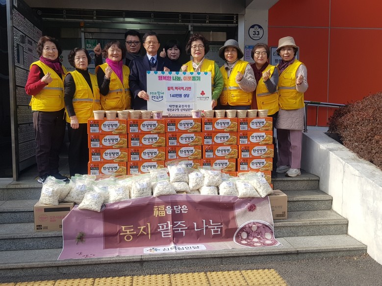 [중구 세계타임즈=이채봉 기자] 대전 중구 은행선화동(동장 이종환)은 대한불교진각종 대전교구청 신덕심인당(주교 현강정사)에서 팥죽 50개, 떡국떡 50개(2kg), 라면 40박스(총 140만 원 상당)를 기탁했다고 28일 밝혔다.