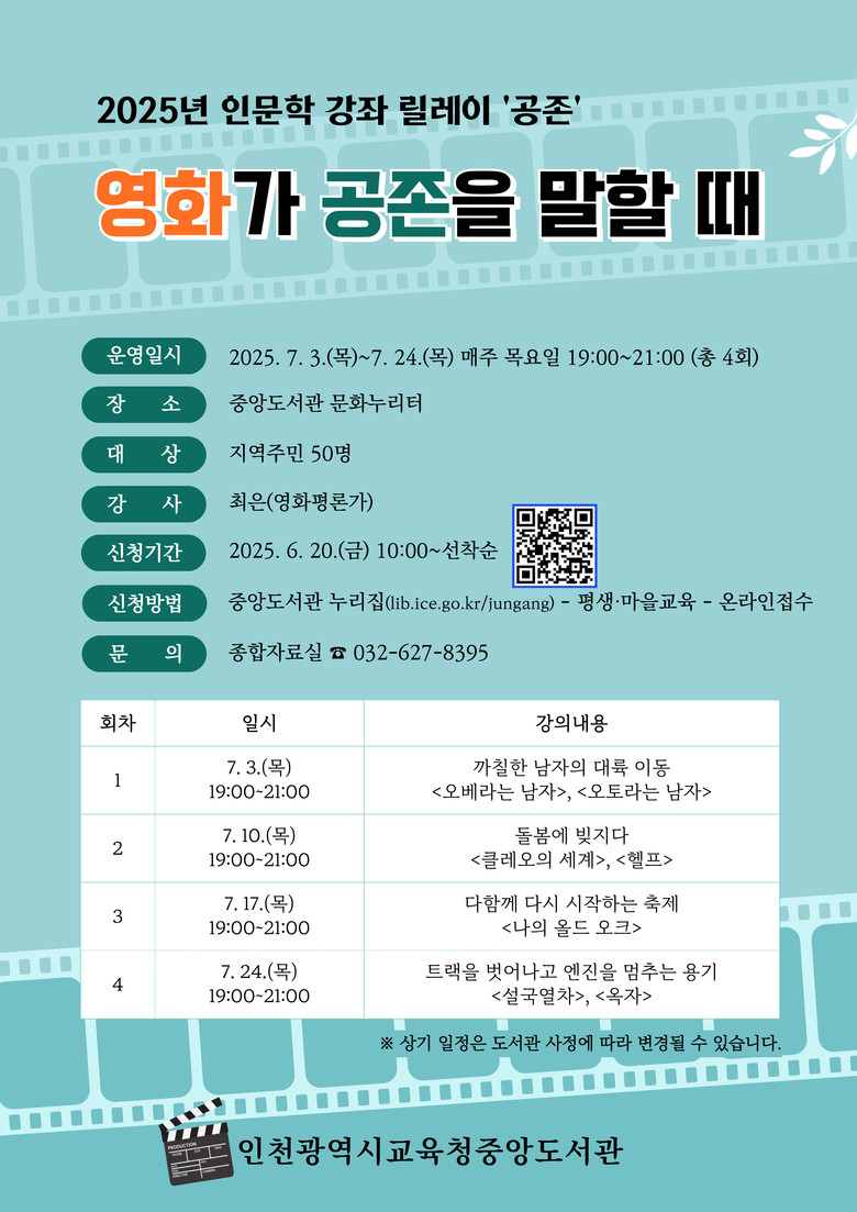 참가 신청은 6월 20일(금) 오전 10시부터 중앙도서관 누리집(https://lib.ice.go.kr/jungang)에서 가능하며, 자세한 문의는 종합자료실(032-627-8395)로 하면 된다.