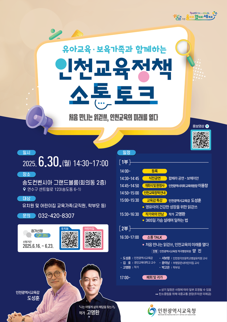 1부에서는 도성훈 교육감과 방송인 겸 작가 고명환의 특강이 진행되며, 2부에서는 ‘처음 만나는 읽걷쓰, 인천교육의 미래를 열다’를 주제로 참석자들과 소통하는 시간이 이어진다.