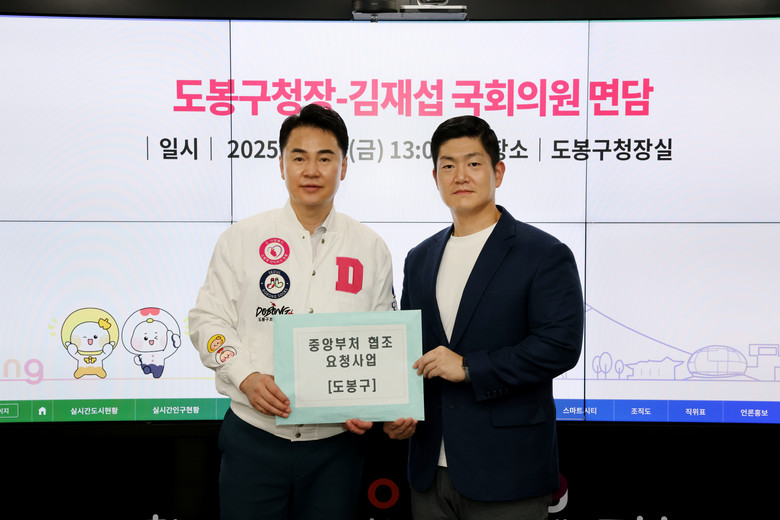| ▲ 오언석 도봉구창장(왼쪽)이 8월 29일 김재섭 국회의원(오른쪽)에게 중앙부처 협조 요청 13개 사업에 관한 사항을 전달했다(2025. 8. 29. 도봉구청 구청장실) |