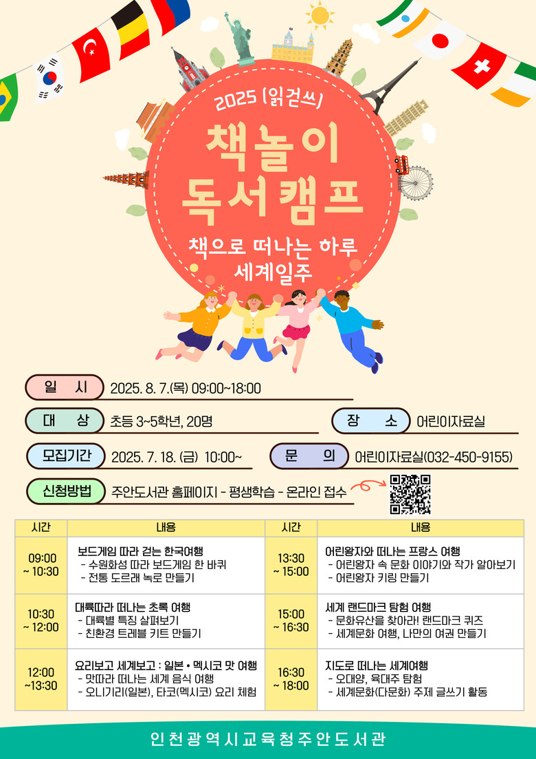 참여 신청은 7월 18일 오전 10시부터 주안도서관 누리집(https://lib.ice.go.kr/juan)에서 선착순 20명 접수하며, 자세한 사항은 주안도서관 누리집 또는 어린이자료실(☎032-450-9155)로 문의하면 된다.
