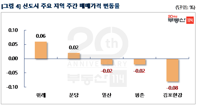 신도시는 △평촌(0.06%) △동탄(0.04%) △분당(0.02%) 등은 상승한 반면 ▼일산(-0.05%) ▼산본(-0.05%)은 하락했다. 평촌은 호계동 목련신동아와 무궁화태영이 500만원 올랐다. 동탄은 청계동 동탄역더샵센트럴시티와 영천동 동탄반도유보라아이비파크2차가 500만원-1,500만원 상승했다. 반면 일산은 주엽동 문촌17단지신안과 마두동 강촌2단지한신이 500만원-1,000만원 떨어졌다.