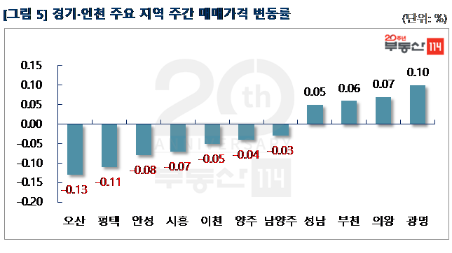 경기ㆍ인천은 ▼오산(-0.13%) ▼평택(-0.11%) ▼안성(-0.08%) ▼시흥(-0.07%) ▼이천(-0.05%) ▼양주(-0.04%) 등 외곽지역의 약세가 두드러졌다. 반면 서울에 인접한 △광명(0.10%) △의왕(0.07%) △부천(0.06%) △성남(0.05%) 등은 상승했다. 오산은 금암동 금암마을6단지휴먼시아데시앙과 죽미마을휴먼시아휴튼9단지가 250만원-500만원 떨어졌다. 평택은 서정동 평택더샵이 500만원-1,000만원 빠졌다. 반면 광명은 하안동 e편한세상센트레빌이 500만원-1,000만원 올랐다. 의왕은 내손동 포일자이와 내손e편한세상이 250만원-2,000만원 상승했다.