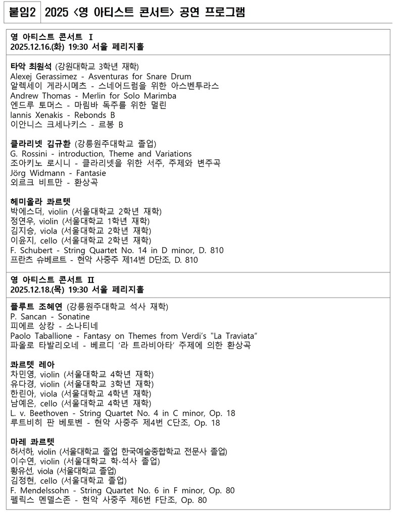 12월 16일(화) 오후 7시 30분 ‘영 아티스트 콘서트 I’은 퍼커셔니스트 최원석(강원대 3학년 재학)의 연주로 시작된다. △알렉세이 게라시메즈의 ‘스네어드럼을 위한 아스벤투라스’, △앤드류 토머스의 ‘마림바 독주를 위한 멀린’, △이안니스 크세나키스의 ‘르봉 B’를 연주하며 현대 타악기의 폭넓은 음색과 리듬 구조를 들려준다. 이어 클라리네티스트 김규환(강릉원주대 졸업)이 △조아키노 로시니의 ‘클라리넷을 위한 서주, 주제와 변주곡’, △외르크 비트만의 ‘환상곡’을 연주한다. 마지막 무대는 헤미올라 스트링 콰르텟(박에스더·정연우·김지승·이윤지, 서울대학교 1.2학년 재학)이 △슈베르트의 ‘현악 사중주 제14번 D단조, D.810, 죽음과 소녀’를 선보이며 마무리한다.
