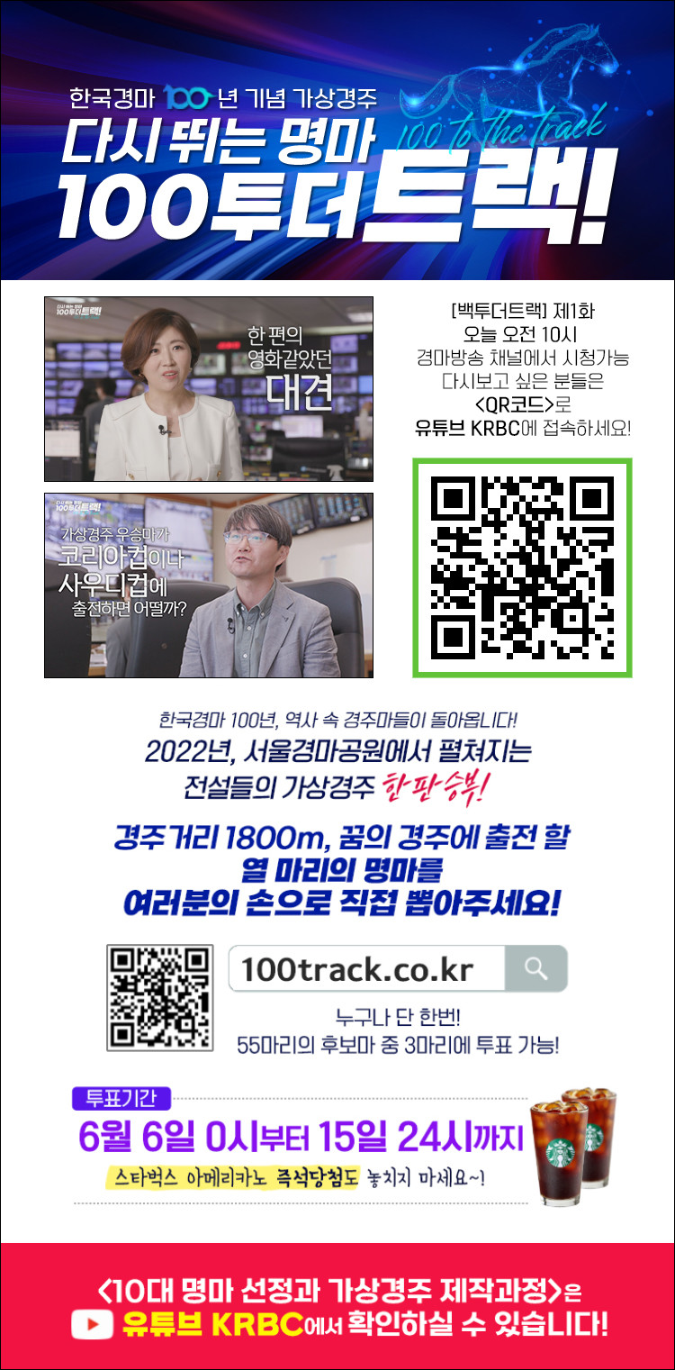 가상경주 ‘100투더 트랙!’ 출전마 투표는 온라인으로 진행되며 6월 6일 0시부터 15일 24시까지 100투더 트랙 공식 홈페이지(100track.co.kr)에서 가능하다. 참가자는 1인당 경주마 3마리까지 뽑을 수 있으며 아메리카노 즉석 당첨의 기회도 함께 찾아온다.