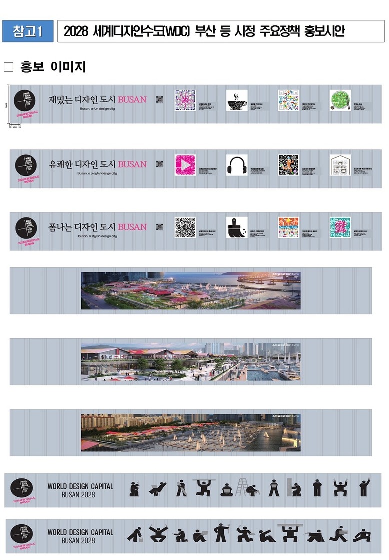◈ 시, '현장 경험 → 온라인 확산(SNS) → 도시브랜드 인지도 제고'로 이어지는 시민 참여·소통형 홍보 구현을 위해 시민이 직접 참여(QR코드)하는 정책 이벤트도 진행 [부산 세계타임즈=이용우 기자] 부산시(시장 박형준)는 더 많은 시민의 참여와 공감을 바탕으로 '2028 세계디자인수도 부산(WDC)' 도시브랜드를 알리기 위해 수영만요트경기장 가설울타리를 활용한 「세계디자인수도(WDC) 등 시정 주요정책 홍보 디자인 전시물」을 제작하고, 「정책 참여형 큐알(QR) 이벤트」를 진행한다고 밝혔다.
