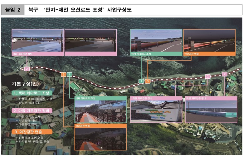 올해 3월 남구 및 북구 관계자와 함께 현장점검 및 합동보고회, 전문가 자문 등을 통해 해안 관광명소 색채마을 조성 관련 최종 사업계획을 확정했다.