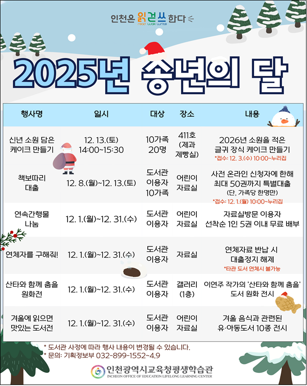 평생학습관 관계자는 “연말을 맞아 어린이들이 책과 함께 따뜻한 시간을 보낼 수 있도록 다양한 배움의 기회를 마련할 계획”이라고 말했다.