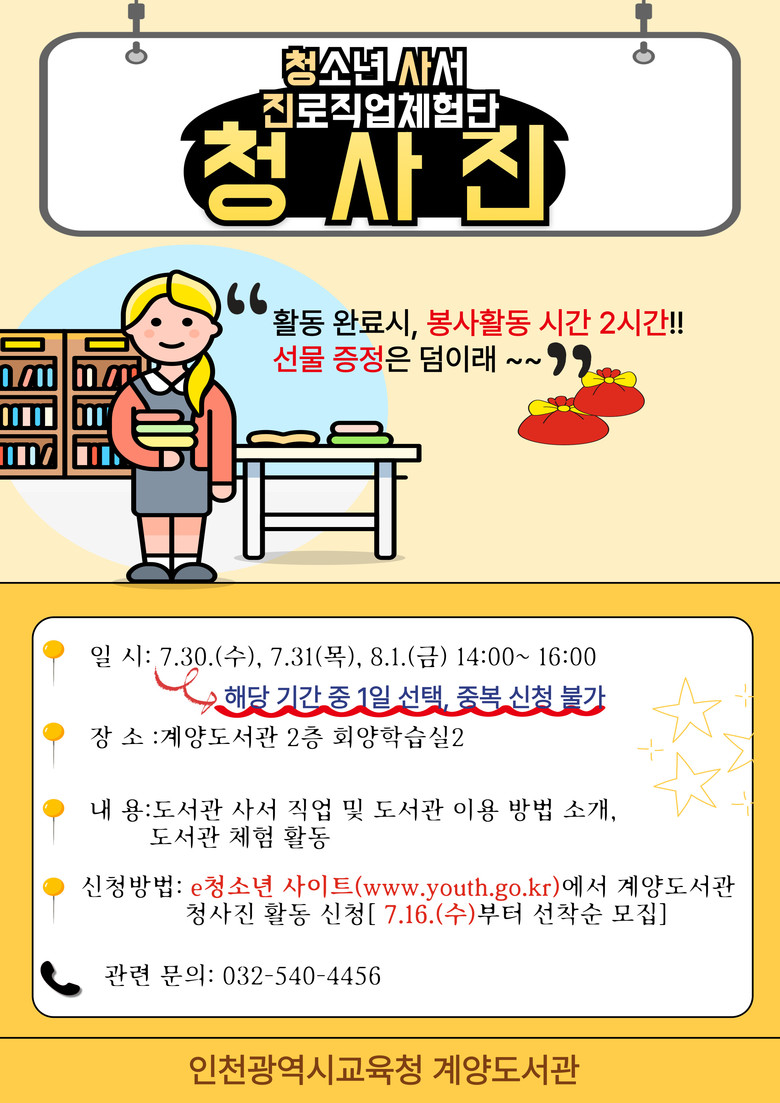 자세한 사항은 계양도서관 종합자료실(☎032-540-4456)로 문의하면 된다.
