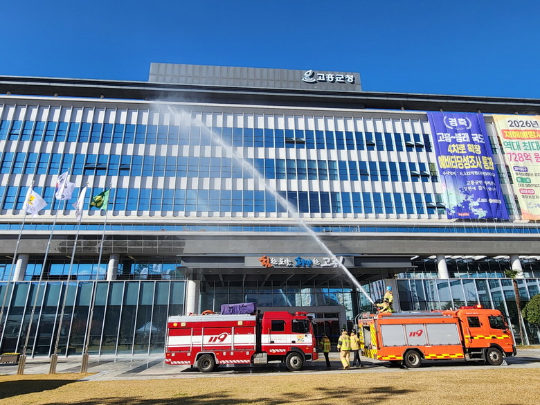 이번 훈련은 공공기관 내 화재 예방과 신속한 인명구조 능력 강화를 목표로 진행됐으며, 고흥군청 자위소방대와 고흥119안전센터 대원 등 직원 300여 명이 참여했다.