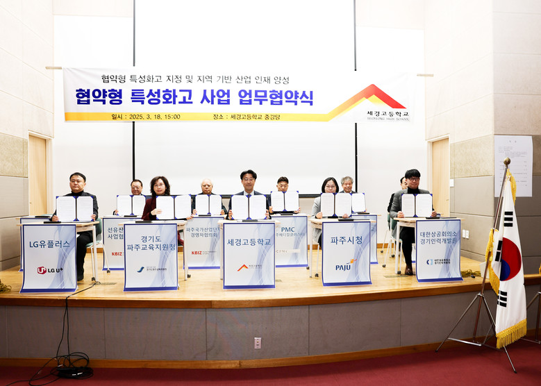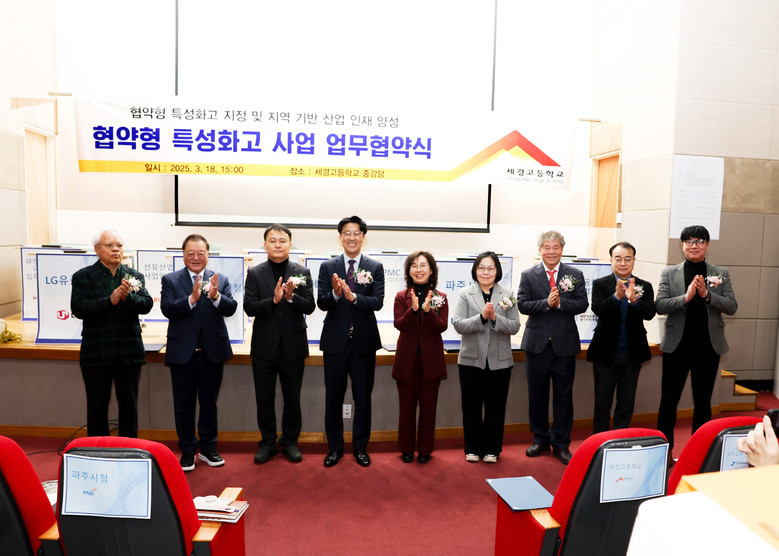 [파주시 세계타임즈=송민수 기자] 세경고등학교(교장 장계홍)는 협약형 특성화고 사업 육성을 위한 업무협약을 지난 18일에 개최했다. 이번 협약은 세경고등학교를 포함하여 파주시청(시장 김경일), 경기도파주교육지원청(교육장 전선아), 파주상공회의소(회장 박종찬),대한상공회의소 경기인력개발원(원장 양재덕), LG유플러스(대표 황현식), PMC파주메디컬클러스터(대표 고주혁), 선유산업단지 사업협동조합(회장 한영돈), 파주국가산업단지 경영자협의회(회장 류재철), 파주출판문화정보국가산업단지 입주기업체협의회(회장 정병철), 두원공과대학(총장 임해규), 서영대학교(총장 김정수) 등 지자체, 교육청, 지역 유관기관, 교육기관, 기업 단체 등이 참석하여 AI 분야 협약형 특성화고 사업을 통해 지역과 함께하고 성장하고 지역에 우수한 인재를 양성하여 지역에 정주하기 위한 목표와 비전을 수립하는 자리를 가졌다.