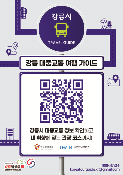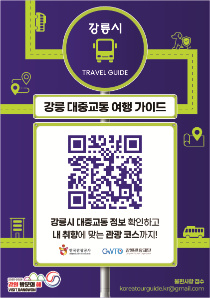 강릉시 대중교통 관광 가이드 플랫폼(https://www.koreatourguide.kr/gwto/landing)은 대중교통을 이용하는 관광객을 대상으로 길 찾기, 테마별 추천 코스, 실시간 시내버스 정보, 시외·고속버스 및 KTX 열차시간 안내와 예약 등의 서비스를 일괄적으로 제공하는 대중교통 통합 안내 플랫폼 서비스이다.