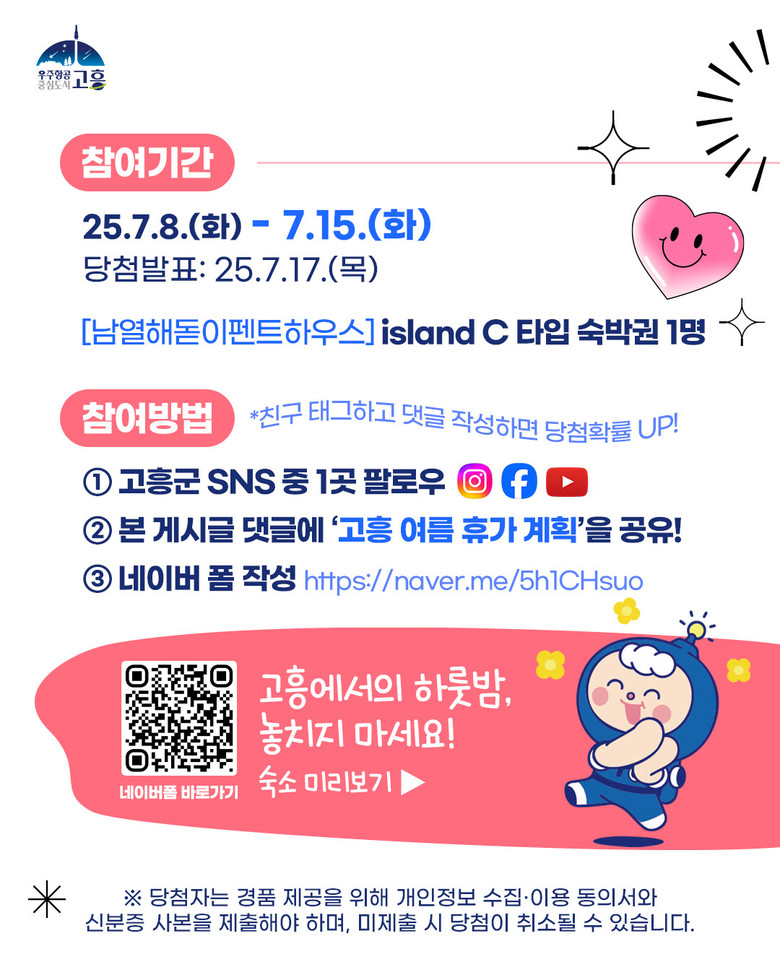당첨자는 랜덤 추첨을 통해 1명을 선정하며, 당첨자 발표는 7월 17일 고흥군 공식 SNS에 게시될 예정이다.