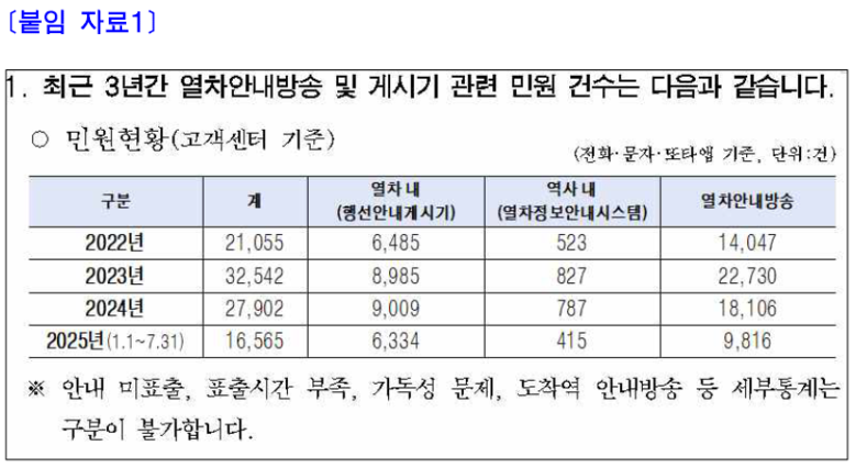공사가 제출한 자료에 따르면, 최근 3년간 지하철 하차역 관련 안내 민원은 매년 7천~9천 건에 달했으며, 올해(2025년)도 이미 7월까지 6,700건이 접수됐다. [※붙임 자료1]