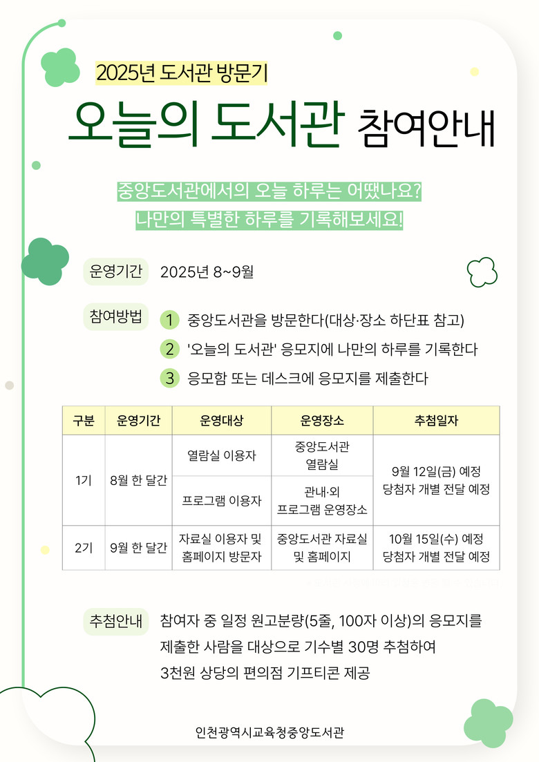 자세한 사항은 중앙도서관 누리집(lib.ice.go.kr/jungang/) 또는 독서문화과(☎032-627-8393)로 문의하면 된다.