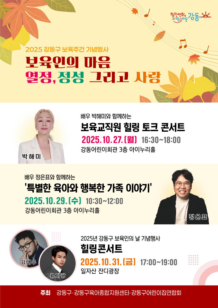 - 뮤지컬 배우 박해미·배우 정은표가 특강으로 전하는 진솔한 인생 이야기와 가족의 행복, 긍정적 육아 메시지 [강동구 세계타임즈=이장성 기자] 강동구(구청장 이수희)는 10월 보육주간을 맞아 강동구육아종합지원센터와 함께 보육 현장에서 애쓰는 보육교직원을 응원하고, 부모들과 실질적인 육아 경험을 나누는 ‘힐링 토크 콘서트 및 부모특강’을 개최한다고 22일 밝혔다.