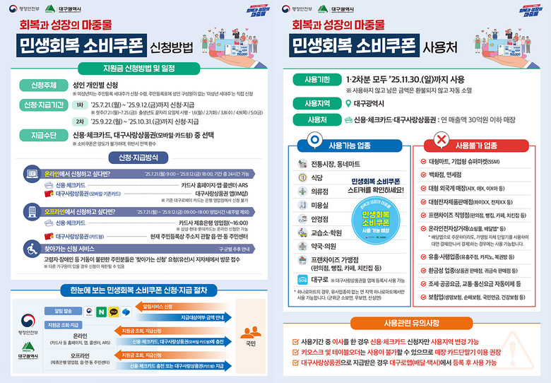 대구광역시 민생회복 소비쿠폰 TF 단장 홍성주 경제부시장은 “이번 민생회복 소비쿠폰을 통해 대구 시민들의 가계 부담도 덜고 지역상권에 즉각적인 활력을 되찾는 경제 선순환 구조가 형성되기를 기대한다”며, “시민이 신청 단계부터 지급·사용까지 불편함이 없도록 만반의 준비를 다하겠다”고 밝혔다.