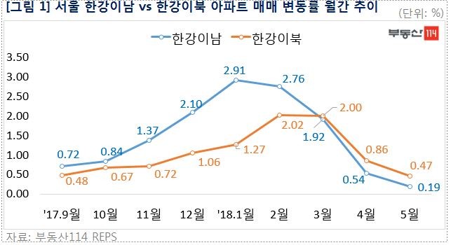 한편, 지난 3월을 기점으로 서울 한강이북(14개 구)과 한강이남(11개 구) 지역의 상승률이 역전된 가운데 강북권 위주의 오름세가 이어지고 있다. 강남 아파트값 상승세가 눈에 띄게 둔화된 반면 상대적으로 규제가 덜한 강북권은 중소형 위주로 실수요 매수세가 유지되고 있는 모습이다.