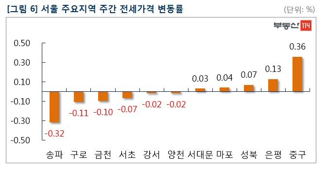 서울은 ▼송파(-0.32%) ▼구로(-0.11%) ▼금천(-0.10%) ▼서초(-0.07%) 등이 내렸고 △중구(0.36%) △은평(0.13%), △성북(0.07%) 등은 상승했다.