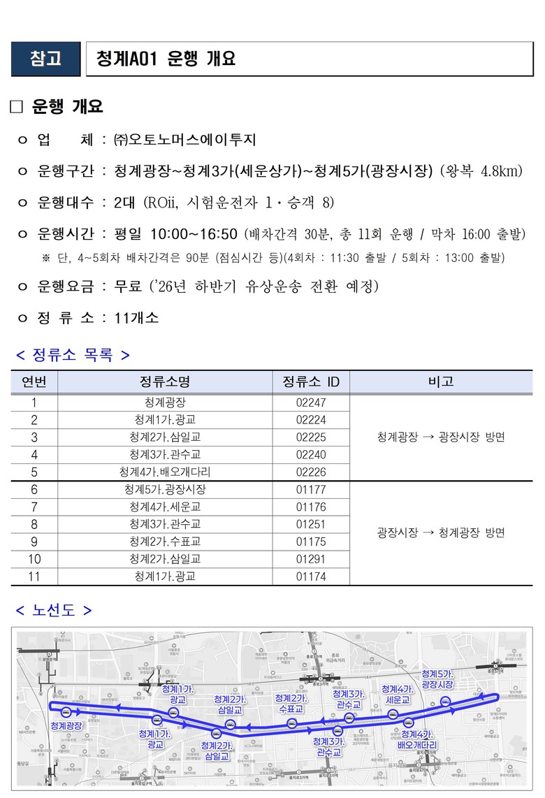 ‘청계A01’은 청계광장~청계3가(세운상가)~청계5가(광장시장) 왕복 4.8km 구간을 차량 2대가 순환 운행하며, 양방향 총 11개의 정류소에 정차한다. 평일 10:00~16:50(기점 기준 16:00 막차 출발)으로, 1일 11회.30분 간격(점심시간 제외)으로 운행한다.