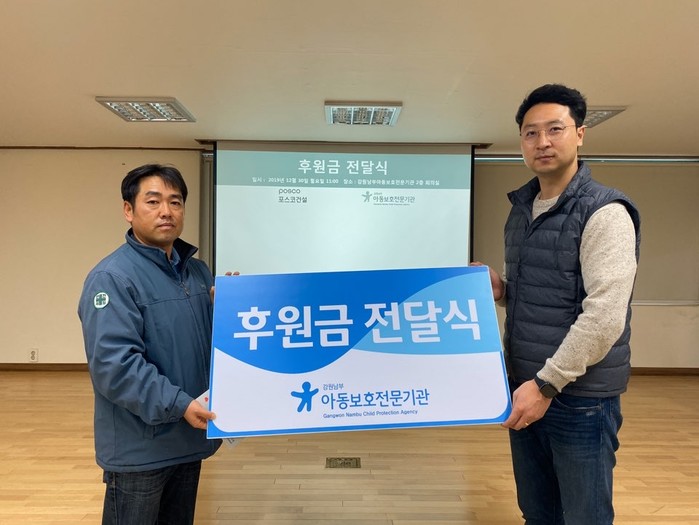 김태훈 포스코건설 동해항 북방파제 2공구 소장은 “전달된 후원금이 지역 내 학대 피해 아동들의 고통을 덜 수 있도록 아동학대 예방사업에 있어 꼭 필요한 곳에 사용되길 원한다”고 말했다.