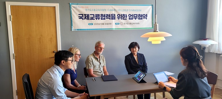 [시흥시 세계타임즈=송민수 기자] 경기도시흥교육지원청(교육장 채열희)은 2025년 8월 26일(화) 덴마크 코펜하겐 소재 감멜 헬레루프 김나지움(교장 비아네 에덜스코우 닐센)과 국제 교육·문화 교류 활성화를 위한 업무협약(MOU)을 체결했다. 이번 협약은 교육·문화 관련 국제교류협력 프로그램을 개발·운영하여 글로벌 역량 확대와 상호 교육협력을 도모하기 위해 마련되었다.