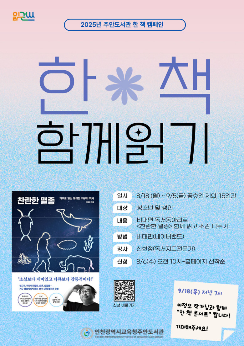 참여 신청은 8월 6일(수) 오전 10시부터 주안도서관 누리집에서 가능하며, 프로그램 종료 후인 9월 18일(목) 오후 7시에는 이정모 작가와 함께하는 ‘한 책 콘서트’도 진행될 예정이다.