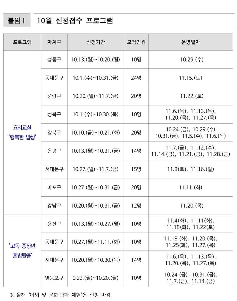 먼저, 요리교실과 소통프로그램으로 구성되어 있는 ‘행복한 밥상’은 지난해 15개 자치구에서 올해 25개 자치구로 확대 운영 중이며, 운영시간 또한 평일 주간·야간, 주말 등으로 다양화하여 직장인 등의 참여 문턱을 낮췄다.