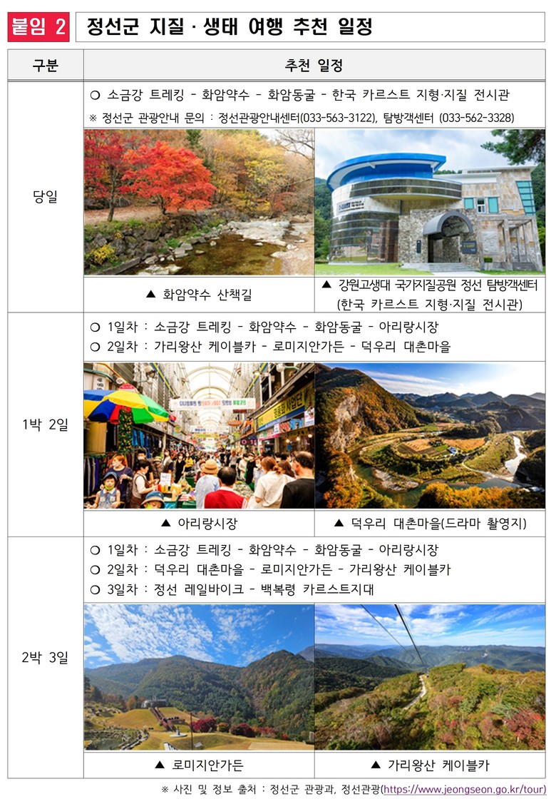 이와 함께 소금강 인근에서는 정선의 대표 가을 축제인 △‘민둥산 은빛 억새축제’(10.2.~11.15.)가 열려, 억새밭 트레킹, 지역 공연, 체험 부스 등 다채로운 행사가 진행된다. 또한 △‘화암약수 사운드 워킹 프로그램’(~11.29.)에서는 맑은 공기 속에서 자연의 소리를 테마로 한 힐링 트레킹을 즐길 수 있어, 지질 탐방과 함께 체험과 휴식을 모두 누릴 수 있다.