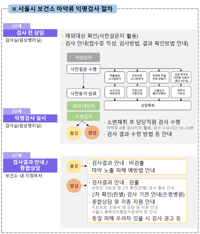 검사 결과가 양성일 경우 2차 확인(판별)이 가능한 검사기관(서울특별시은평병원)을 안내하며, 종합상담 및 각종 지원이 가능한 치료기관 및 서울시 중독관리통합지원센터에 대한 정보도 제공한다. 특히 은평병원은 마약류 중독자 치료보호사업 참여 동의 시 확인 검사, 진료, 상담 등 치료비를 지원하고 있다.