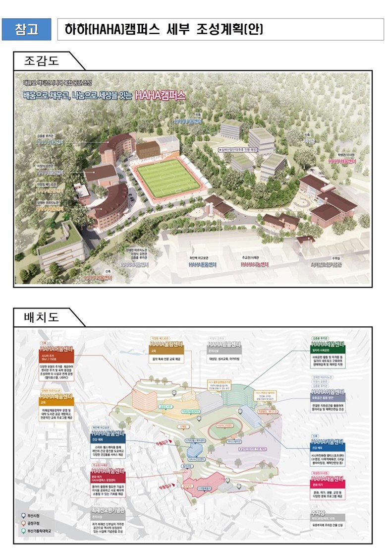 한편, '하하(HAHA)캠퍼스 조성사업'은 어르신들의 활기차고 건강한 노후생활을 지원하기 위해 부산가톨릭대학교 신학교정 6만 3천515제곱미터(㎡)의 부지 내 유휴시설을 활용해 활동적 장년(액티브 시니어)*과 시민들을 위한 문화·여가, 건강·체육, 교육, 일자리, 주거, 실버산업 등을 하나로 집약한 시니어 복합단지를 조성하는 사업이다.