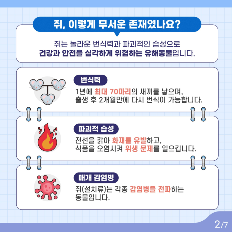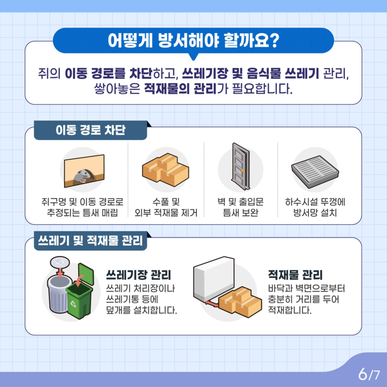공공구역에서 쥐를 발견했을 때는 직접 잡거나 만지지 말고, ‘120 다산콜센터’ 또는 관할 자치구 보건소로 신고해야 한다. 주거지와 상가에서는 음식물쓰레기를 밀폐 용기에 담아 지정된 시간에 배출하고, 정기 방제·배수구 틈새 봉쇄·주변 정돈을 통해 은신처를 차단해야 한다.