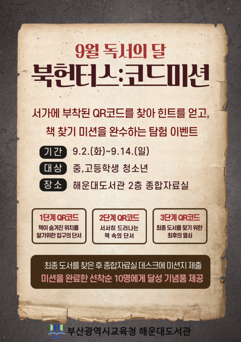 프로그램은 도서관 청소년 서가에 부착된 QR코드를 활용해 힌트를 얻어 책 찾기 미션을 수행하는 체험행사다. 최종 도서를 찾아 미션지를 완성해 종합자료실에 제출하면 기념품을 제공한다. 도서관은 참가자들이 미션을 수행하는 동안 자유롭게 도서관을 탐색하며 도서관 자료와 공간에 대한 이해도를 높일 것으로 기대한다.