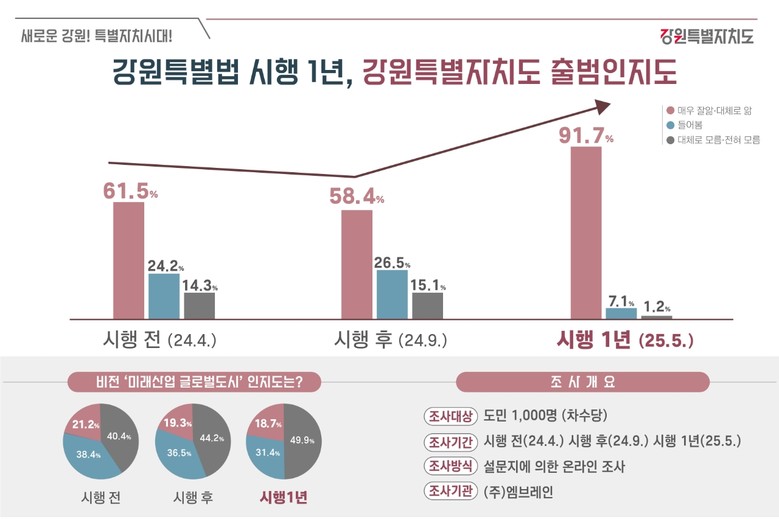 조사 결과, 강원특별자치도 출범에 대한 도민 인지도는 시행 전에는 매우 잘 알고 있거나 대체로 알고 있다고 응답한 비율이 61.5%였으나 시행 1년 후 91.7%로 크게 상승한 것으로 나타났다.