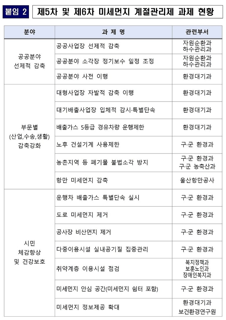 지난 제5차(2023년 12월~2024년 3월)와 제6차 계절관리제(2024년 12월~2025년 3월) 기간에 울산시는 4개 분야에서 16개 사업을 추진했다.