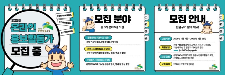 [은평구 세계타임즈=이장성 기자] 서울 은평구(구청장 김미경)는 주민 참여형 사회관계망서비스(SNS) 콘텐츠를 확대하고 구정 홍보의 다양성을 높이기 위해 오는 25일까지 ‘2026년 은평구 온라인 홍보활동가’를 모집한다고 밝혔다.