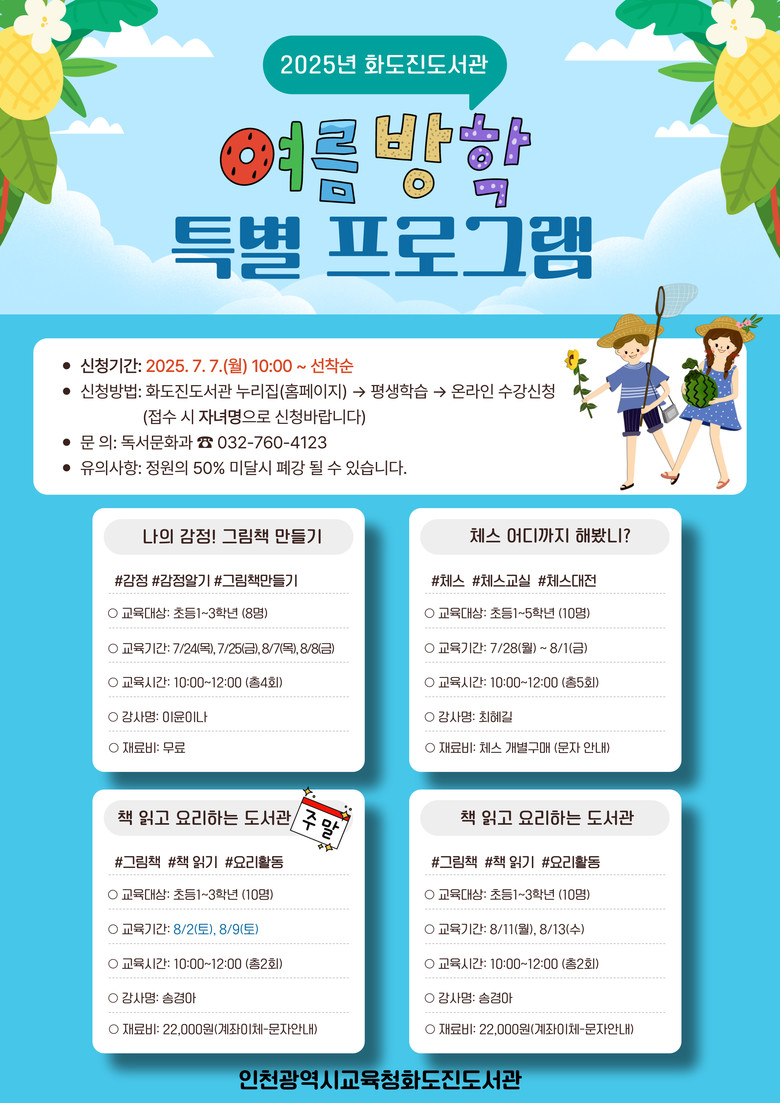 참가 신청은 7월 7일(월) 오전 10시부터 화도진도서관 누리집(https://lib.ice.go.kr/hwadojin)에서 가능하며, 수강료는 무료다.