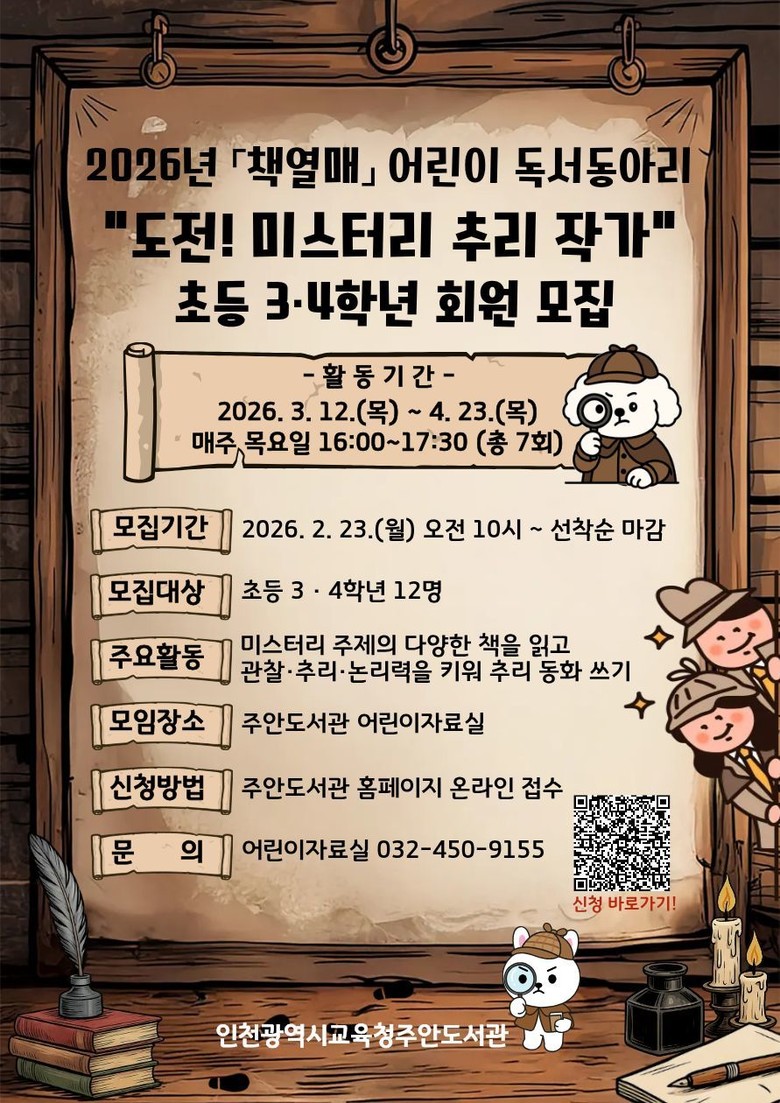 모집은 2월 23일 오전 10시부터 주안도서관 누리집에서 선착순 진행하며, 자세한 내용은 주안도서관 누리집을 확인하거나 어린이자료실( ☎032-450-9155)로 문의하면 된다.
