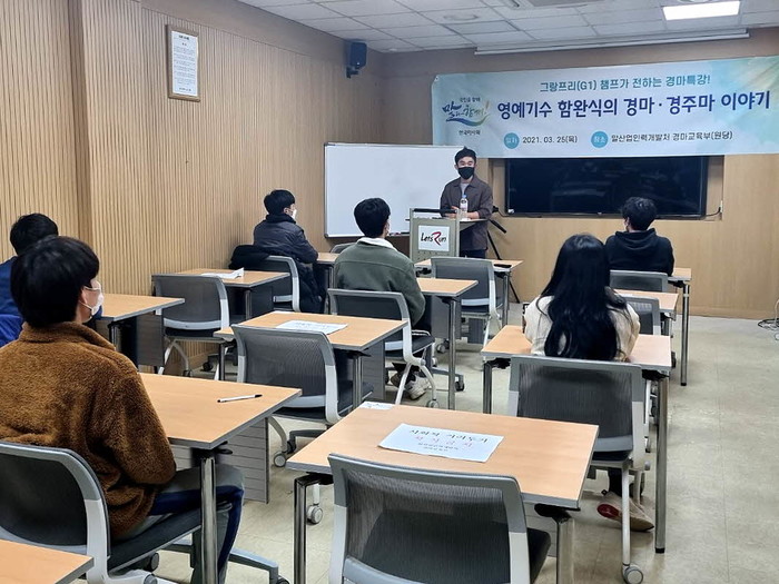 [세계타임즈 심귀영 기자]한국경마 영예기수인 함완식 기수가 지난 25일(목) 원당 소재 한국마사회(회장 김우남) 경마아카데미에서 기수 후보생들에게 현직 기수만의 노하우를 담은 특별한 강의를 실시했다. 지난 98년 경마아카데미를 졸업한 함완식 기수로서는 23년 만의 금의환향이다.