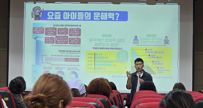 10월 16일 2회차 연수에서는 EBS <당신의 문해력>, <책맹인류> 등을 연출한 민정홍 PD가 강사로 나서, AI(인공지능) 시대 학교교육에서의 문해력과 공동체성의 역할을 주제로 강연을 펼쳤다.