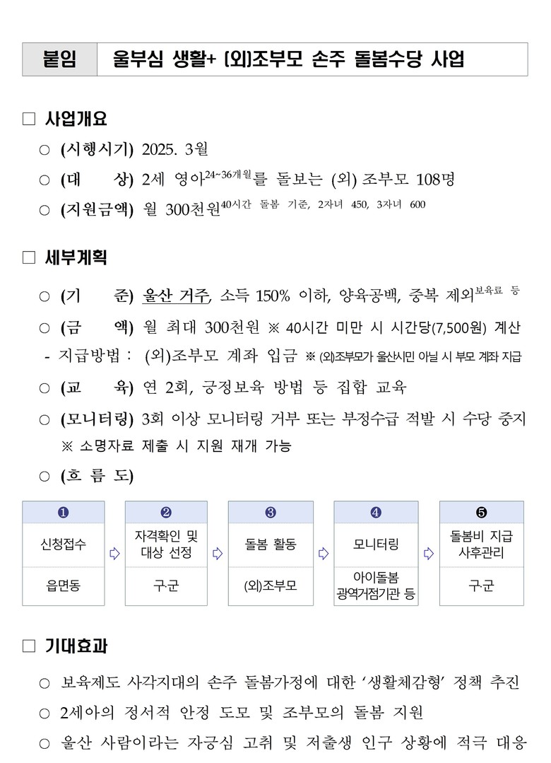 돌봄 수당은 울산에 거주하는 중위소득 150% 이하 가구의 2세 영아를 돌보는 (외)조부모를 대상으로 한다.